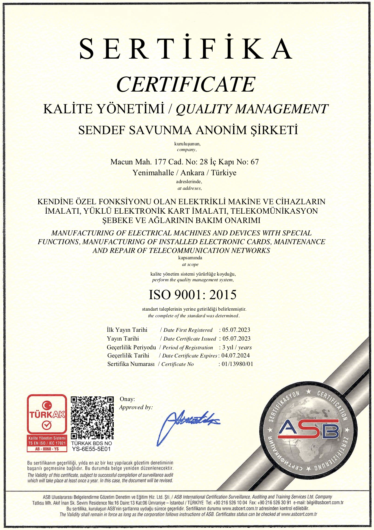 Sendef, ISO 9001:2015 kalite belgesine sahiptir ve