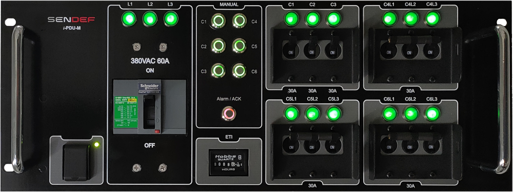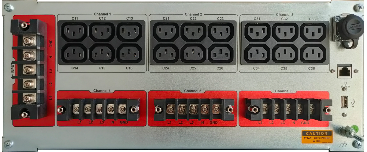 Faz başına 60 Amper giriş, 3 adet 3 faz 30A ve 3 adet tek faz 30A çıkış grubu bulunmaktadır. 30A çıkış gruplarının her biri 6 adet IEC 320 C13 bağlantı imkanı sunmaktadır. Tek faz kanallarda faz ve nötr birlikte anahtarlanmaktadır. Çıkış kanalları PDU üzerindeki manual açma kapama butonları ile, RCU üzerinden, PDU Manager yazılımı vasıtası ile veya SCPI arayüz ile kontrol edilebilmektedir.