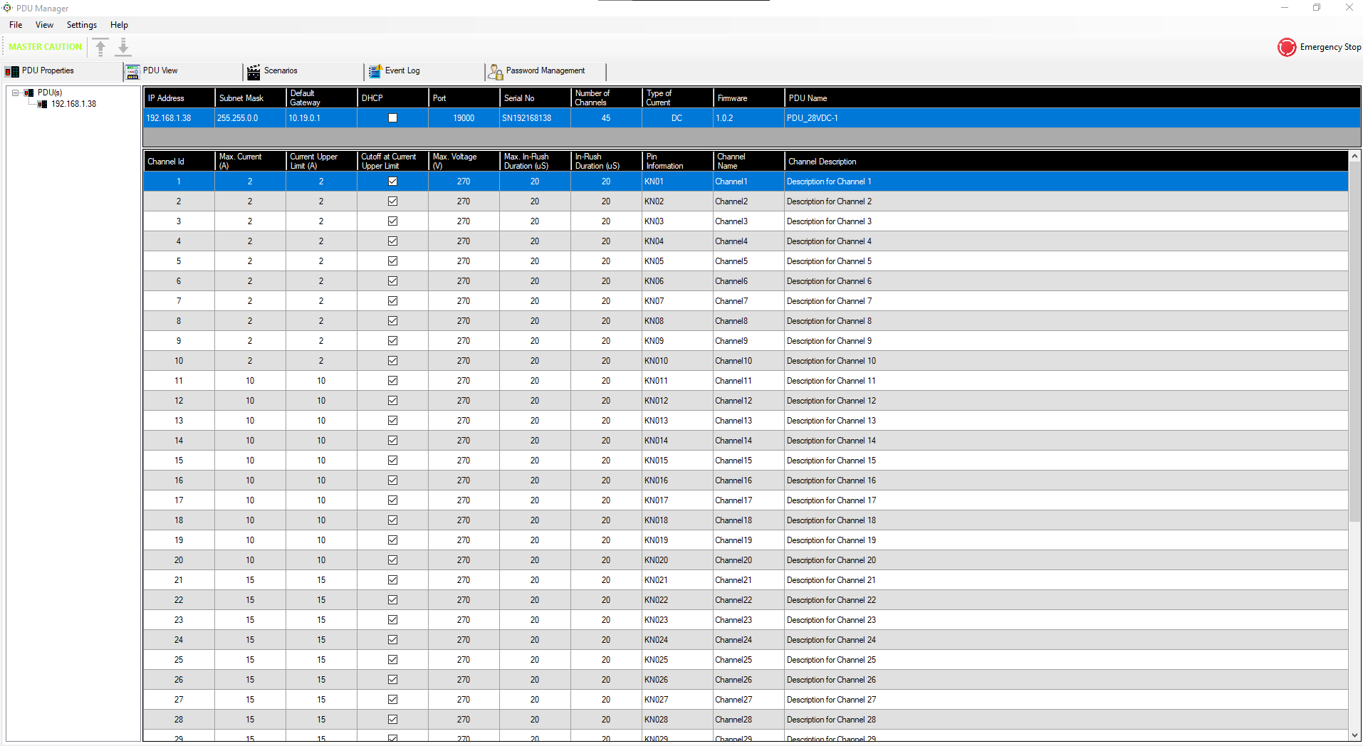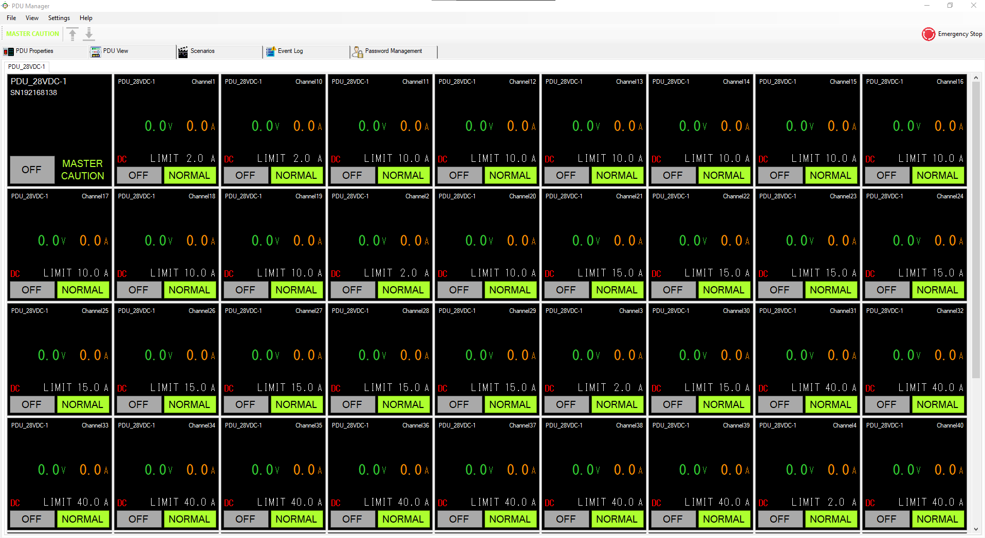 Herbir senaryo için ayrı ayrı oluşturulabilen bu ekran üzerinden istenilen tüm çıkış kanallarının sürekli olarak gözlemlenmesi mümkündür. Akım ve Voltaj ölçümlerinin yanı sıra GDB/GK ismi, kullanıcı tarafından verilen kanal ismi, kanal limit değeri anlık olarak gösterilmektedir. Bu ekran üzerinden birimler tek tek reset edilebileceği gibi sağ üst köşede bulunan “Emergency Stop” soft butonu ile yazılıma tanımlı tüm birimler üzerindeki tüm kanallar aynı anda kapatılabilmektedir.